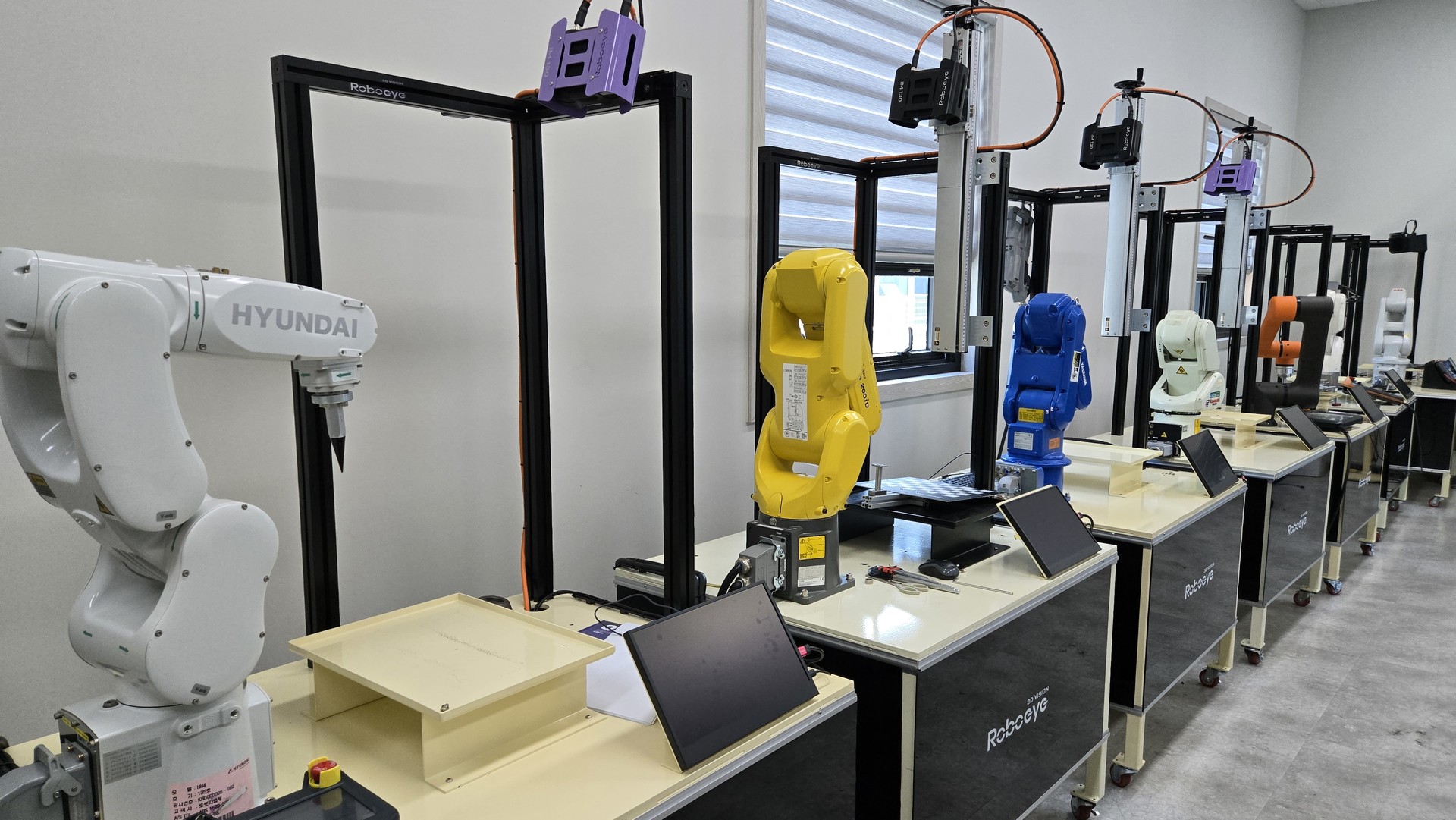 현대로보틱스, 쿠카, 야스카와, ABB, 한화, 가와사키, 화낙, UR 총 8종 로봇과 PLC등